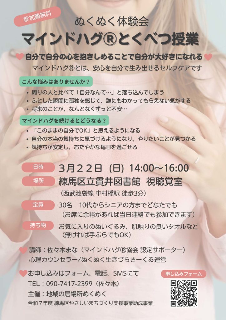 ●テーマ:マインドハグⓇとくべつ授業~自分で自分の心を抱きしめ、安心を自ら生み出せるようになるセルフケア