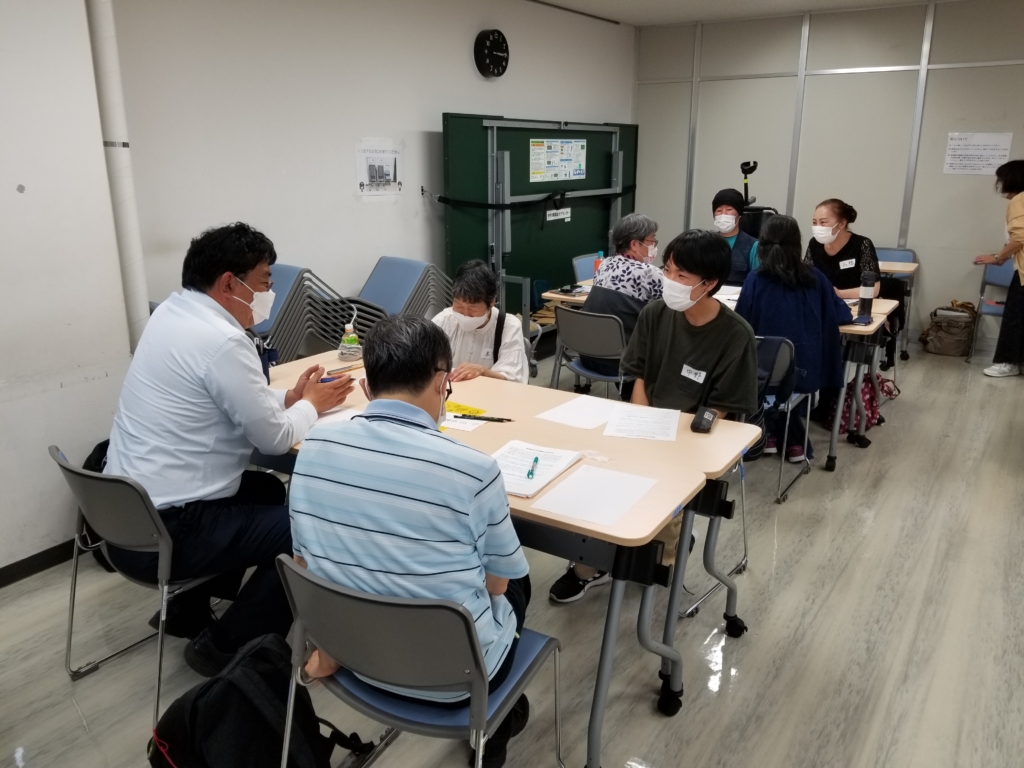 10分の休憩の間に、テーブルを前後合わせて、A~Dグループの4つのグループに分かれます。このグループ分けは、A:大泉グループ、B:石神井グループ、C:中村橋グループ、D:練馬・光が丘グループというふうにお住まいの地域によって分けました。