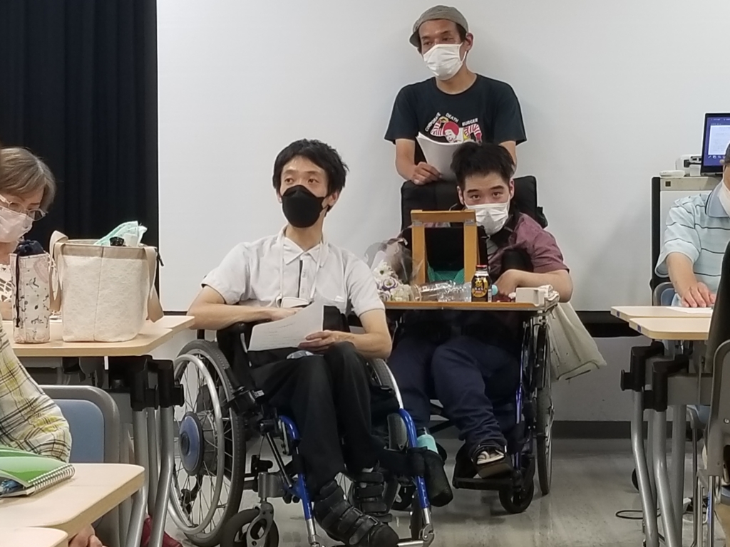 発語が不自由な大江さんは、文字を打って音声変換するトーキングエイドというツールによってお話をして下さいます。事前に準備した資料をプロジェクターで映し出し、大江さんの介助ヘルパーの山内さんの解説により、大江さんの生い立ちや生活の様子など、お話を伺いました。ときどき大江さんのトーキングエイドを使っての補足が入ります。