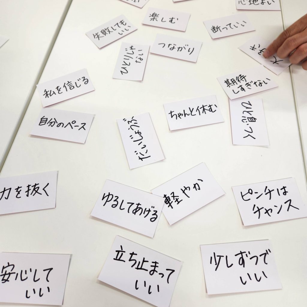 私が考えたぬくぬく言葉を書いたカードを40枚用意して、参加の方々に、今年の自分に大切だと「心で感じた」言葉を2枚ずつ選んでもらってお話していただきました。