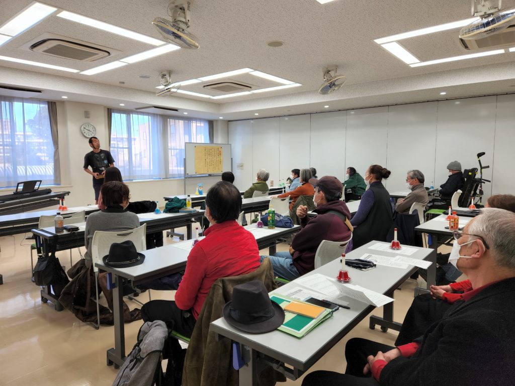後半は、みんなで体験!ということで、みんなで「ジングルベル」をミュージックベルで演奏。ベルを一人1本ずつ配り、まずはみんなで歌詞で歌い、次に階名で歌い、ベルの練習です。メロディーとハーモニーに分けて練習、合わせて練習、最初は音がまばらだったのが、数回の練習でちゃんとジングルベルの音がきれいに聞こえてきました。