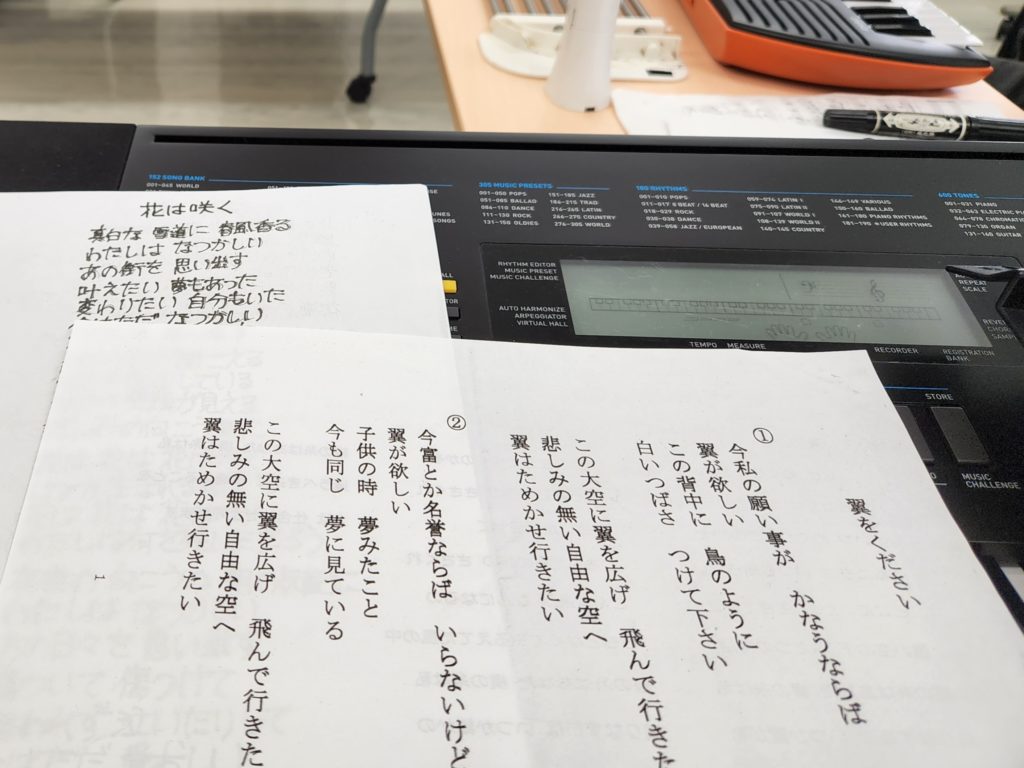 後半は歌タイム。今回用意した歌は「翼を下さい」「糸」「花は咲く」「花(春のうららの~)」の4曲と、前回と同じ「春が来た」の手話歌。偶然に参加者のHさんがキーボードで「翼を下さい」を準備してきて下さったということで、「翼を下さい」伴奏はHさんにお願いしました。