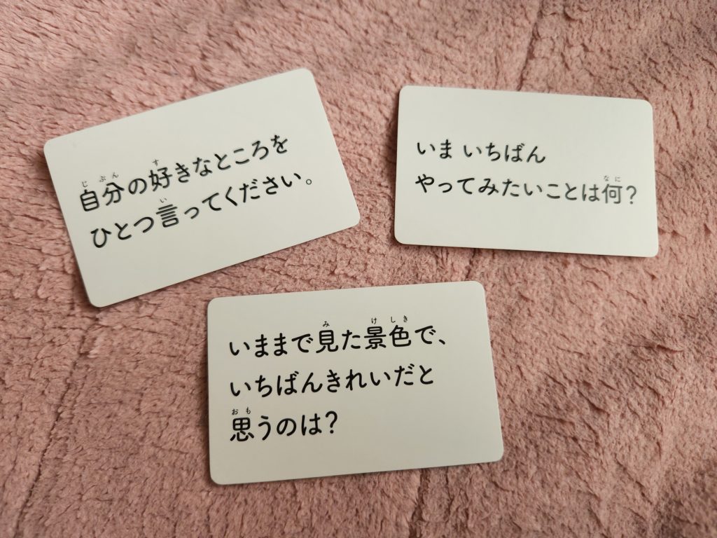 前半はカードゲームで自己紹介を兼ねたトーク。今回私が引いたカードは「いままで見た景色でいちばんきれいだと思うのは?」「いまいちばんやってみたいことは何?」「自分の好きなところをひとつ言ってください」の3枚。このお題で一人ずつ最初に名前を言って自己紹介も兼ねながらお話します。お題に絡めてお話が広がる方もいれば、シンプルにお題の答えだけを言う方もいます。どちらもOKです。